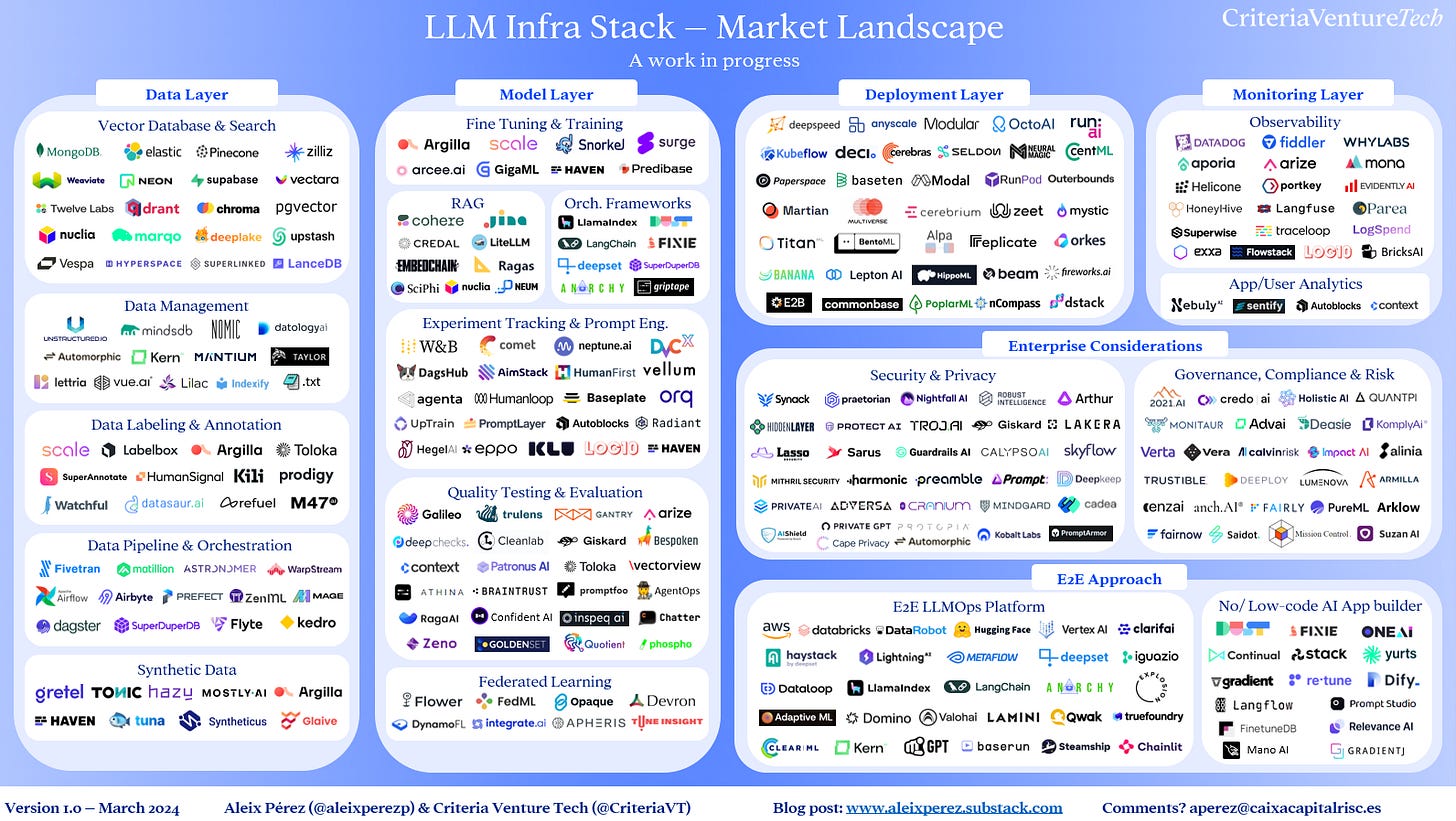 2024's AI evolution highlights the LLM infrastructure stack, pivotal for future AI applications. This deep dive by Aleix Pérez and Criteria Venture Tech into the stack uncovers crucial layers from data handling and model creation to deployment and oversight, essential for driving AI advancements. With a whopping $10 billion backing, it's a thrilling era for AI innovation. The venture into this domain isn't just about technology; it's about shaping the future of AI applications. Read more here.